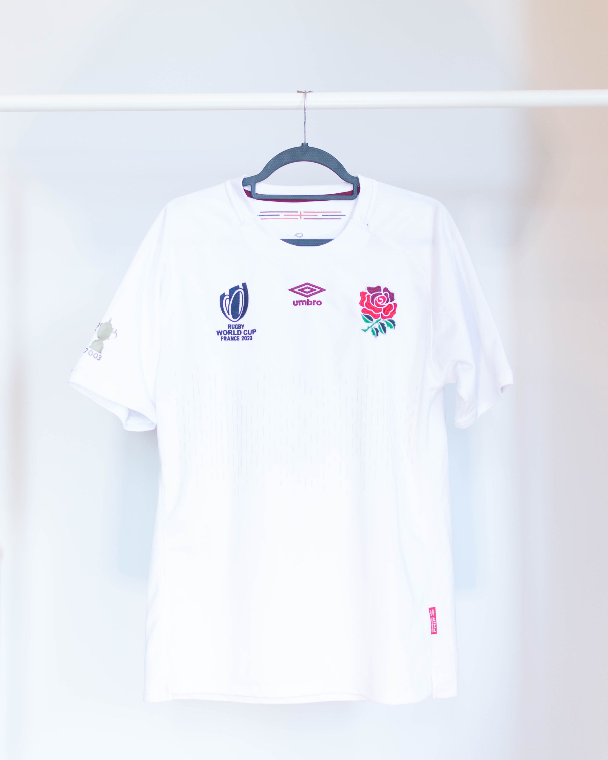 England home jersey from the 2023 Rugby World Cup with number 15 on the back.